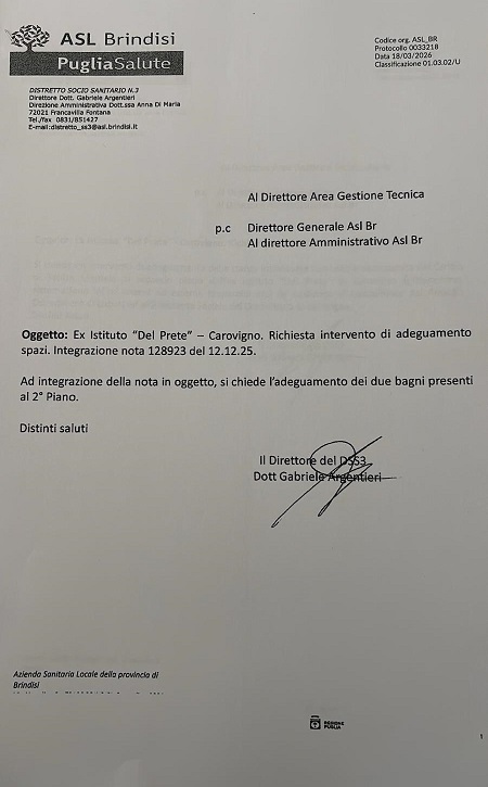LAVORI DI ADEGUAMENTO N.2 WC UFFICIO PROTESI E STANZA CENTRALINO PRESSO IL P.2° DELL’ISTITUTO DEL PRETE DI CAROVIGNO(BR) - AFFIDAMENTO LAVORI DITTA WORLD ENERGY SOCIETÀ COOPERATIVA – CIG: BA9D8659BF. |